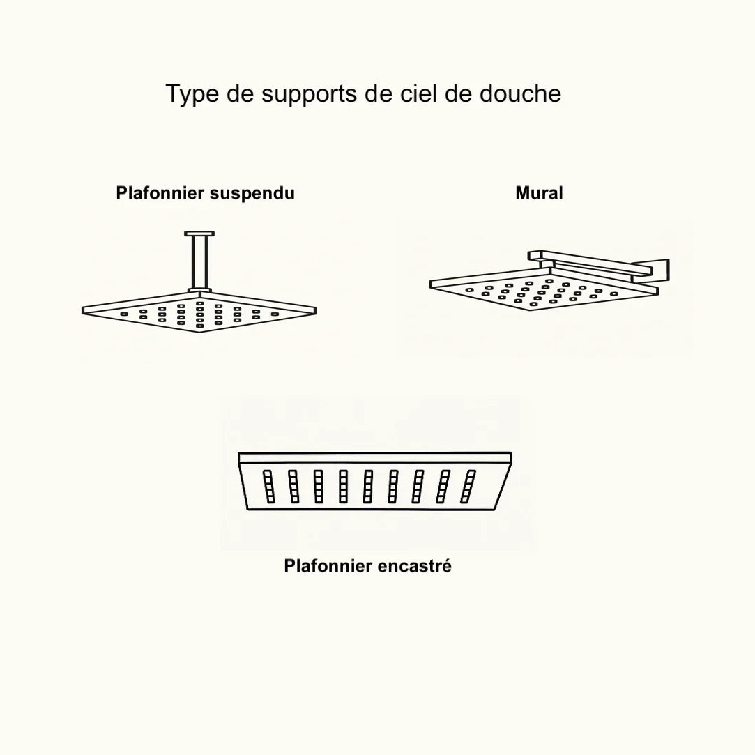 Le ciel de pluie carré, type plafonnier ou mural, est inclinable à 360° et disponible dans plusieurs dimensions, afin de s'ajuster à la perfection à votre installation.