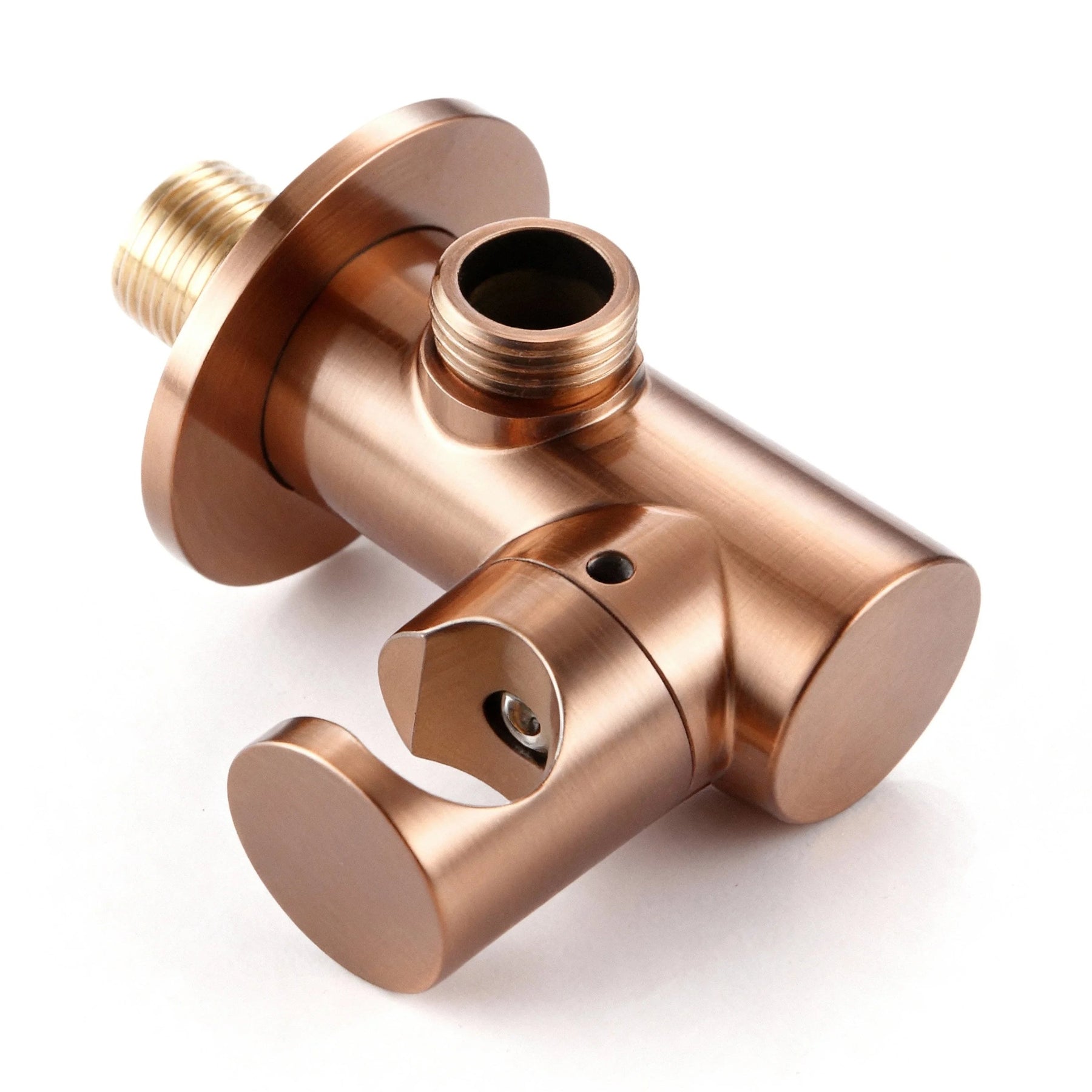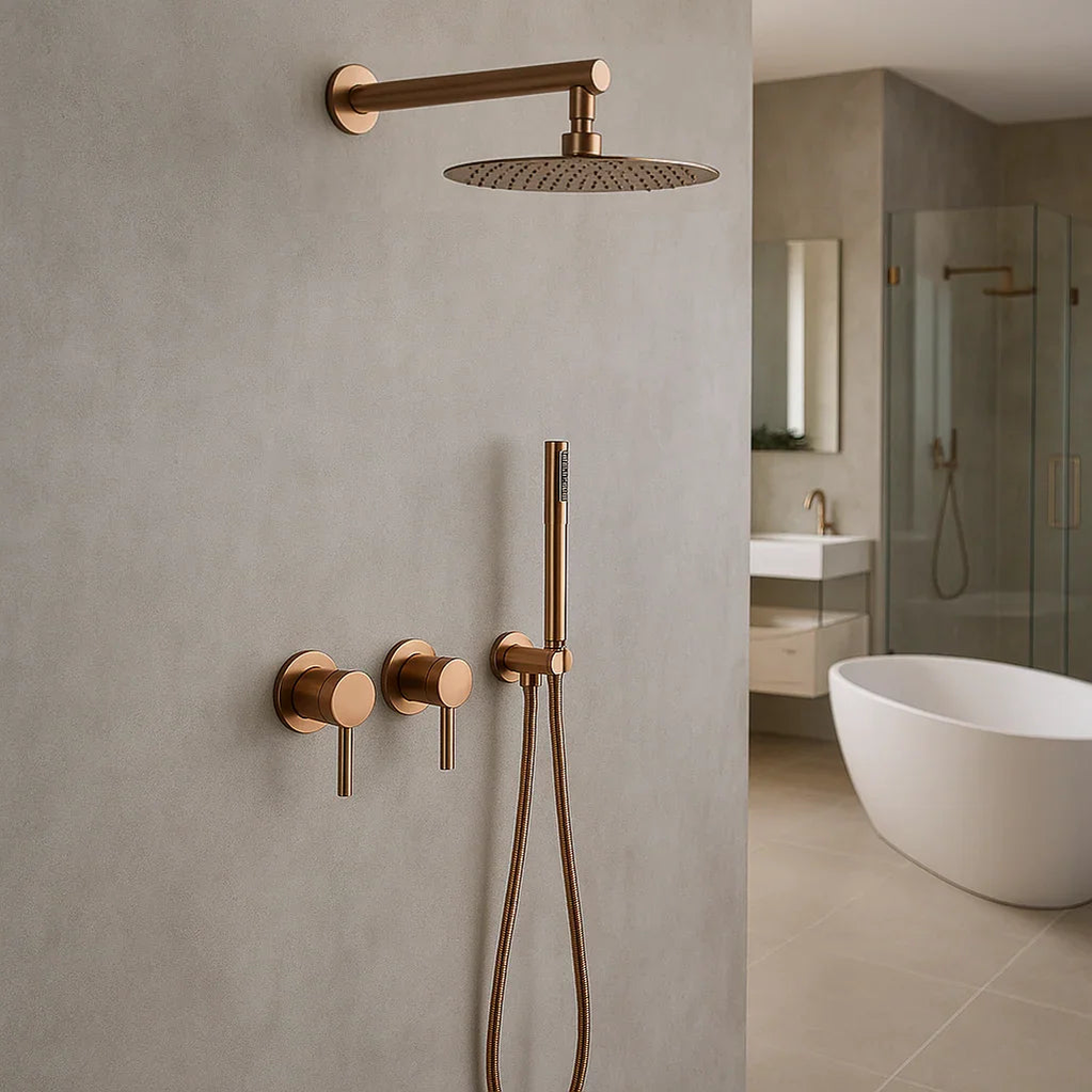 Ensemble de douche mécanique en finition or rose brossé, équipé d'une douchette à main au design épuré et d'un ciel de douche déclinable à 360° en plusieurs diamètres suivant vos besoins.