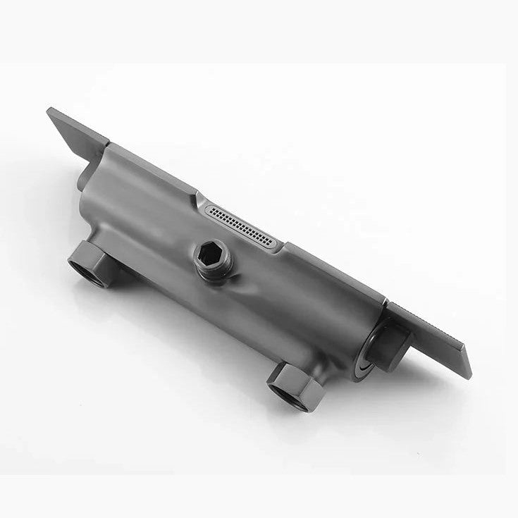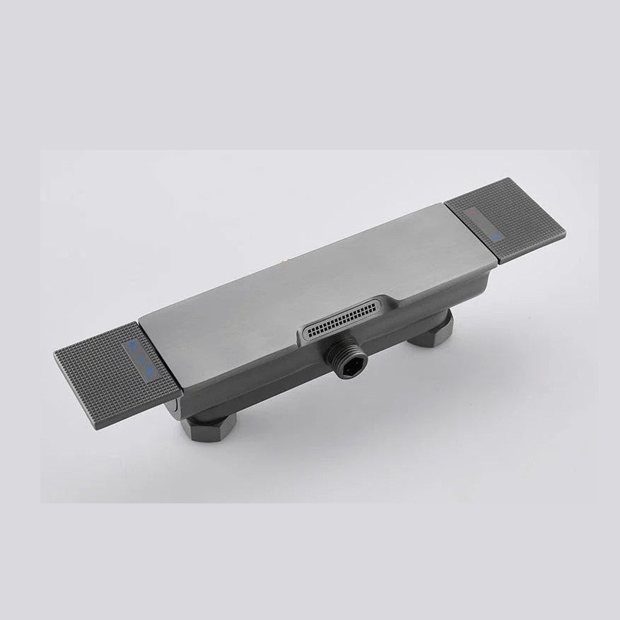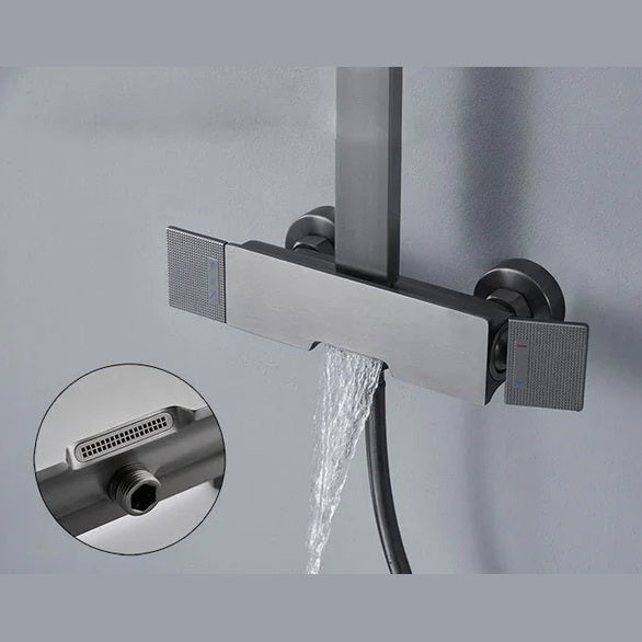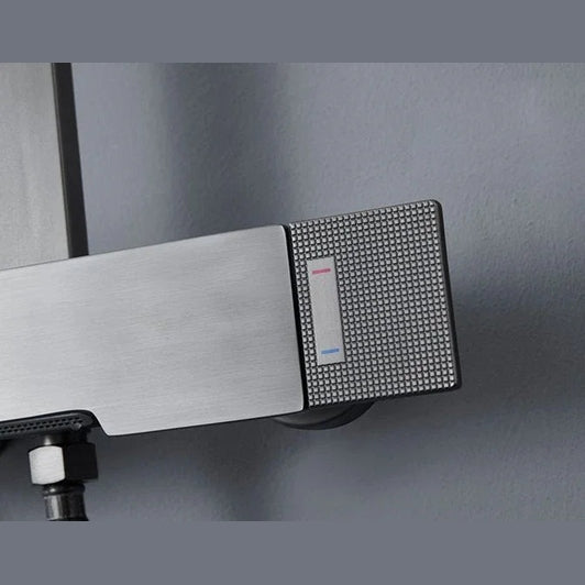 Colonne de douche thermostatique en finition gris brossé, équipée d'une douchette à main multi-jets et d'un ciel de douche rectangulaire. Également pourvue d’un bec verseur, elle sera idéale au dessus de votre baignoire. Il est conseillé de positionner son mitigeur à une hauteur standard de douche de 110 cm par rapport au sol. Elle est constituée de laiton et d'alliage d'acier inoxydable pour une durabilité exemplaire.