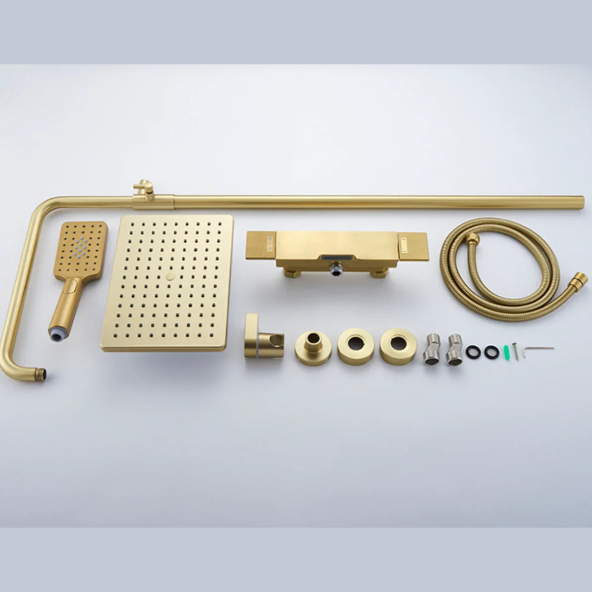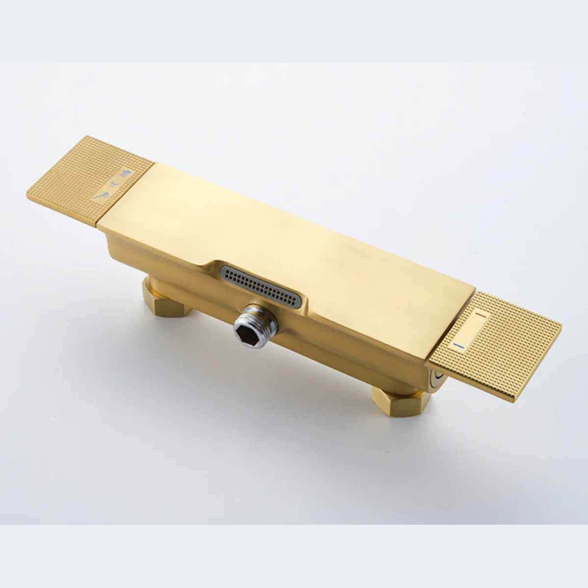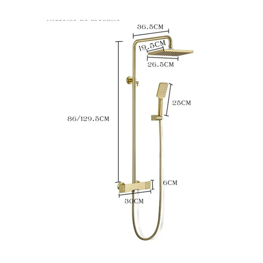 Colonne de douche en finition or brossé, équipée d'une douchette à main rectangulaire et d'un ciel de douche rectangulaires. Également pourvue d’un bec verseur, elle sera idéale au dessus de votre baignoire. Il est conseillé de positionner son mitigeur à une hauteur standard de douche de 110 cm par rapport au sol. Elle est constituée de laiton et d'alliage d'acier inoxydable pour une durabilité exemplaire.