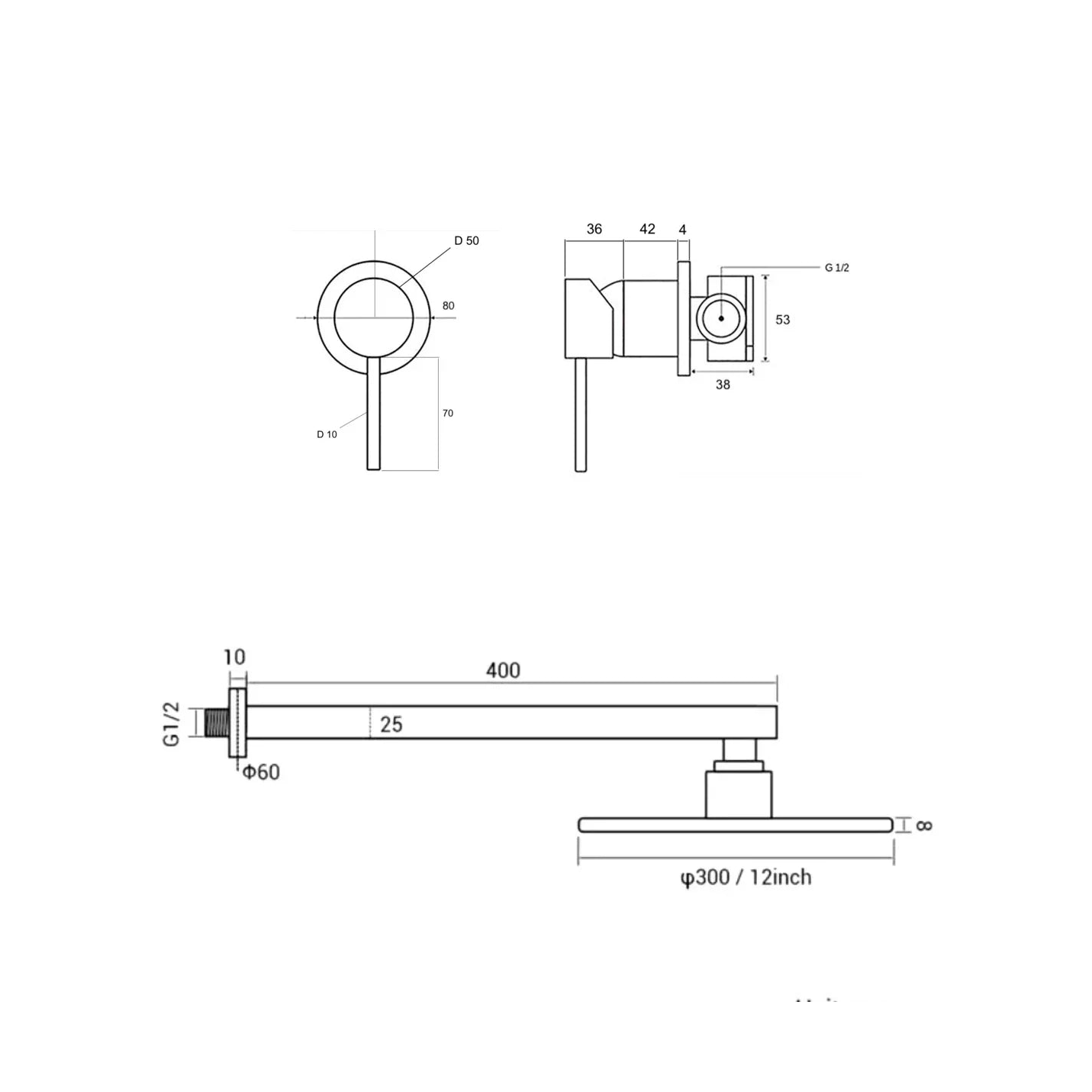 Equipée d'un simple mitigeur pour un design minimaliste, ce kit de douche encastré est disponible avec support de ciel de pluie mural ou plafonnier.