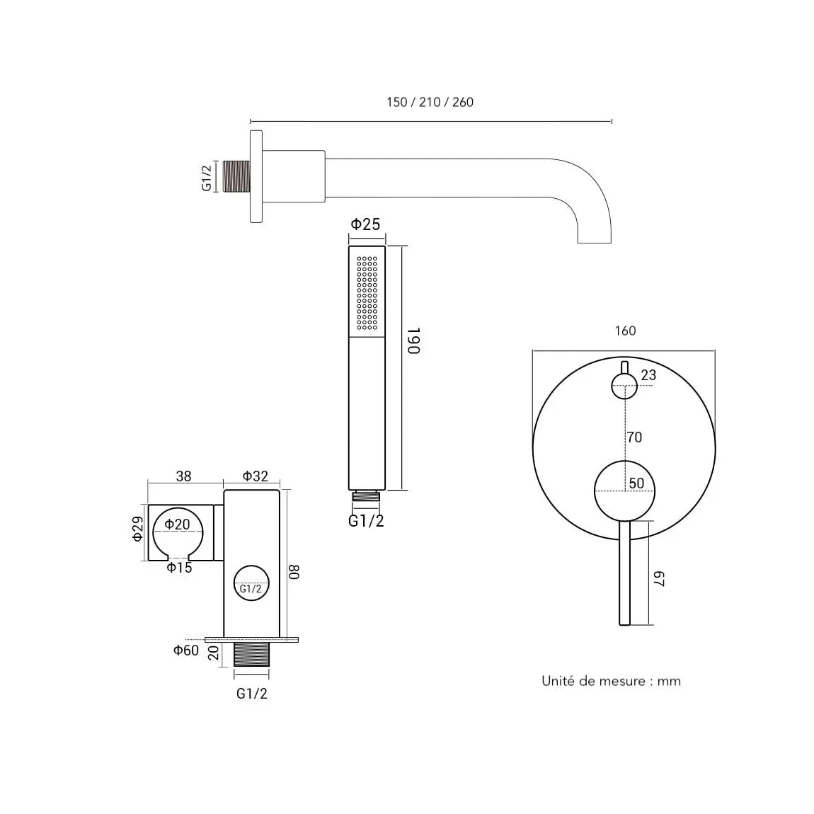 Son mélangeur encastré aux lignes épurées assure une régulation précise du débit et de la température de l'eau, tandis que la douchette à main et la pomme de douche effet pluie offrent un confort incomparable.