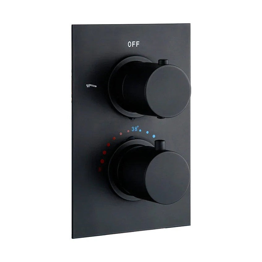 Ensemble de douche thermostatique en finition noir mat, équipé d'un ciel de douche disponible dans différents diamètres et d'une douchette à main au design épuré.