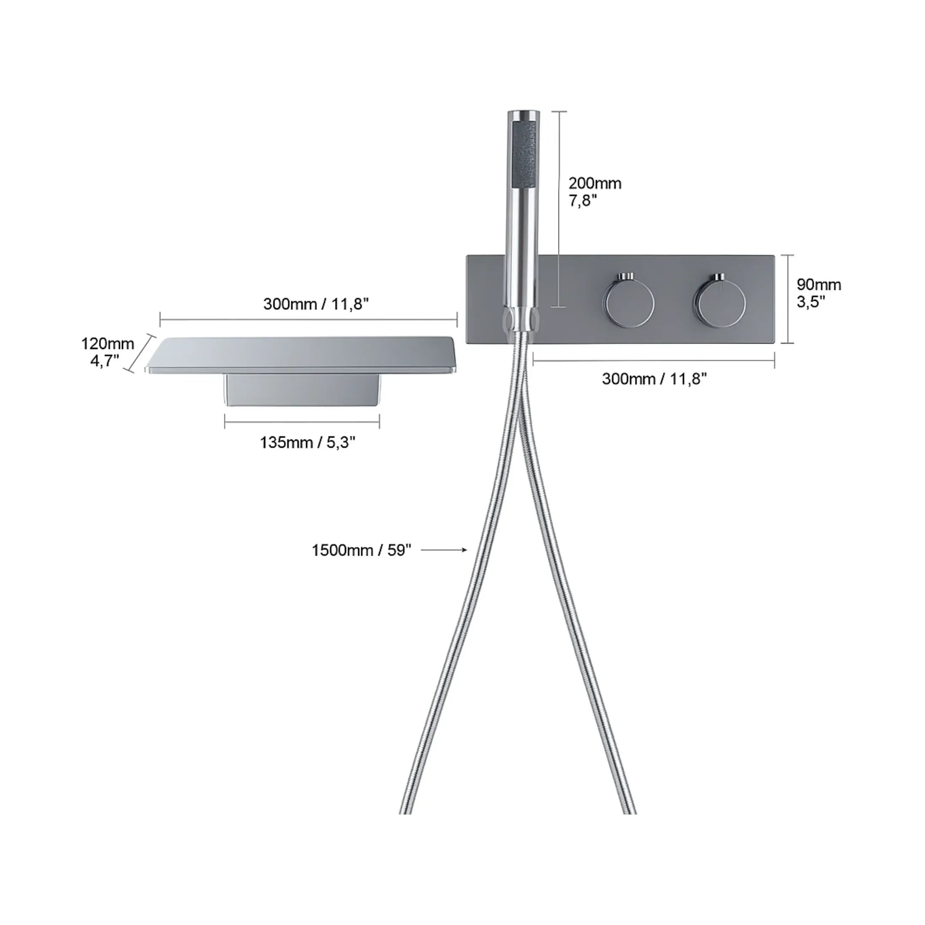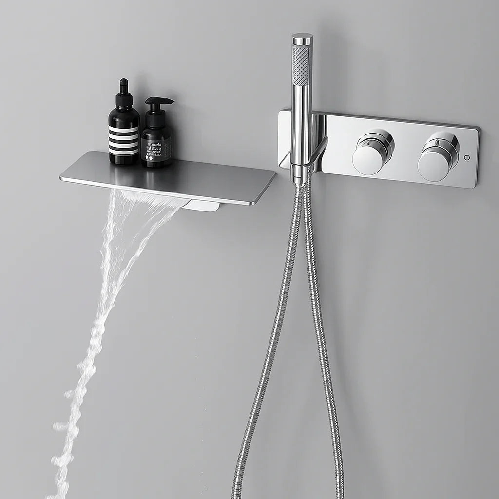 Colonne de bain et de douche thermostatique en finition chrome, équipée d'une douchette à main au design épuré et d'un bec verseur pour baignoire extra plat. Ce bec verseur est indépendant du reste des poignées de commande, ce qui vous laissera libre choix de la positionner à l'endroit idéal pour votre installation. Il sert également de tablette pour votre savon.