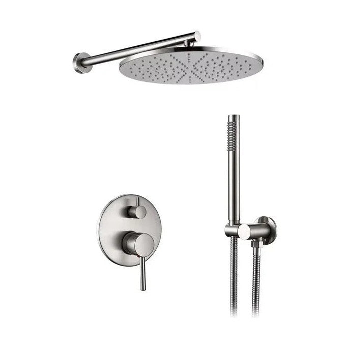 Ensemble de douche en finition acier brossé, équipé d'une douchette à main au design épuré et d'un ciel de couche disponibles dans différentes dimensions.