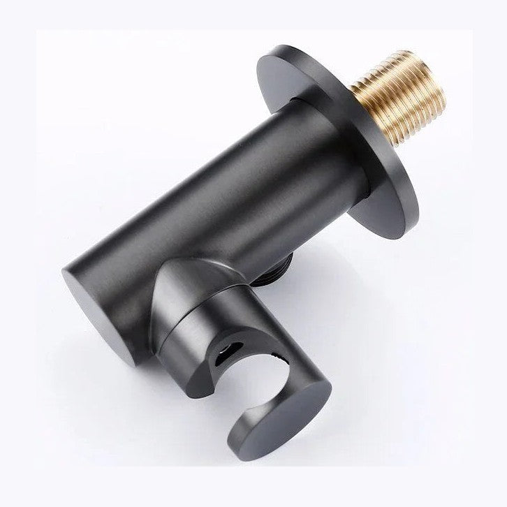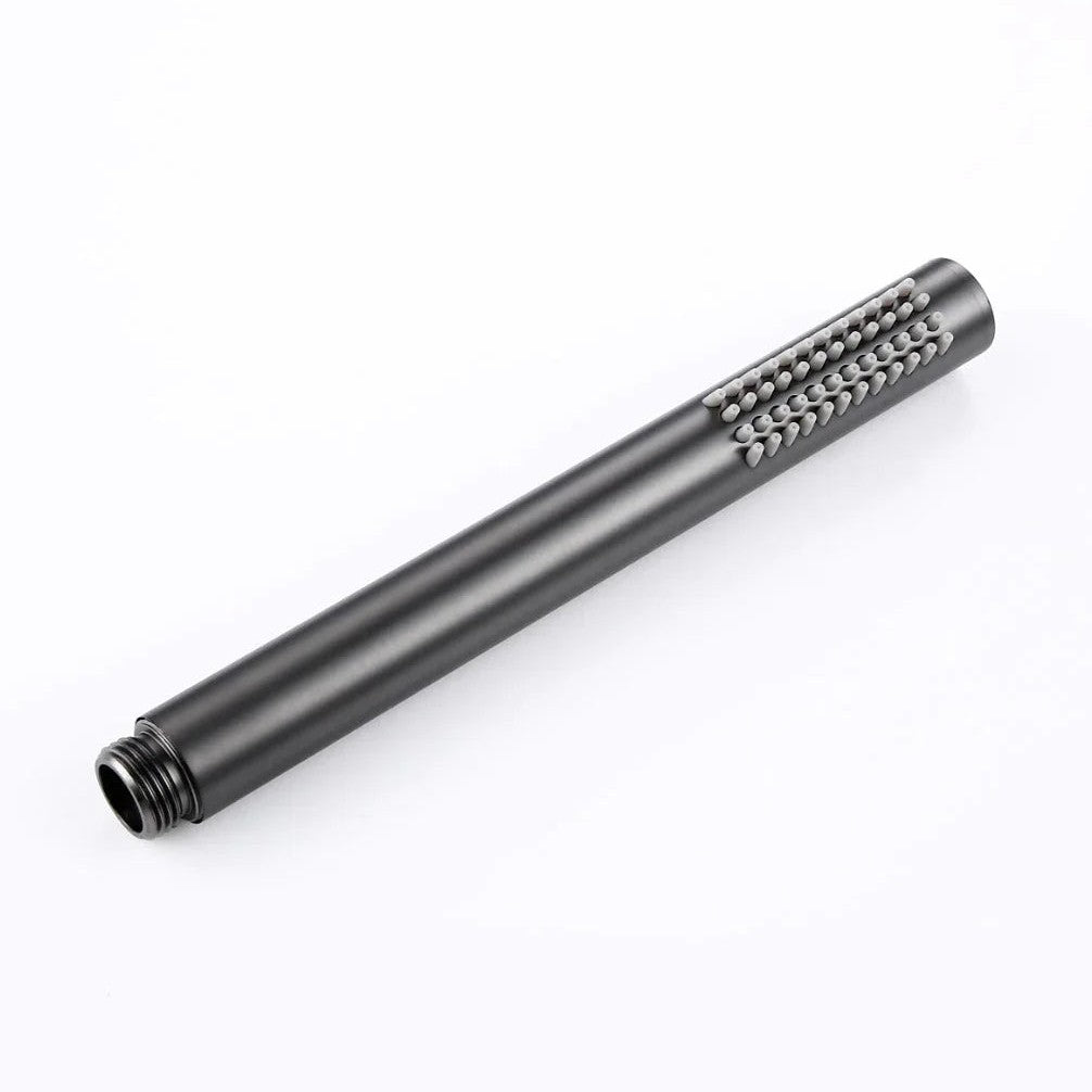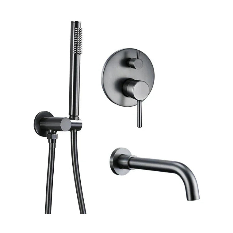 Ensemble de bain thermostatique en finition or gris brossé, équipé d'une douchette à main au design épuré et d'un mitigeur thermostatique rond avec permuteur intégré.
