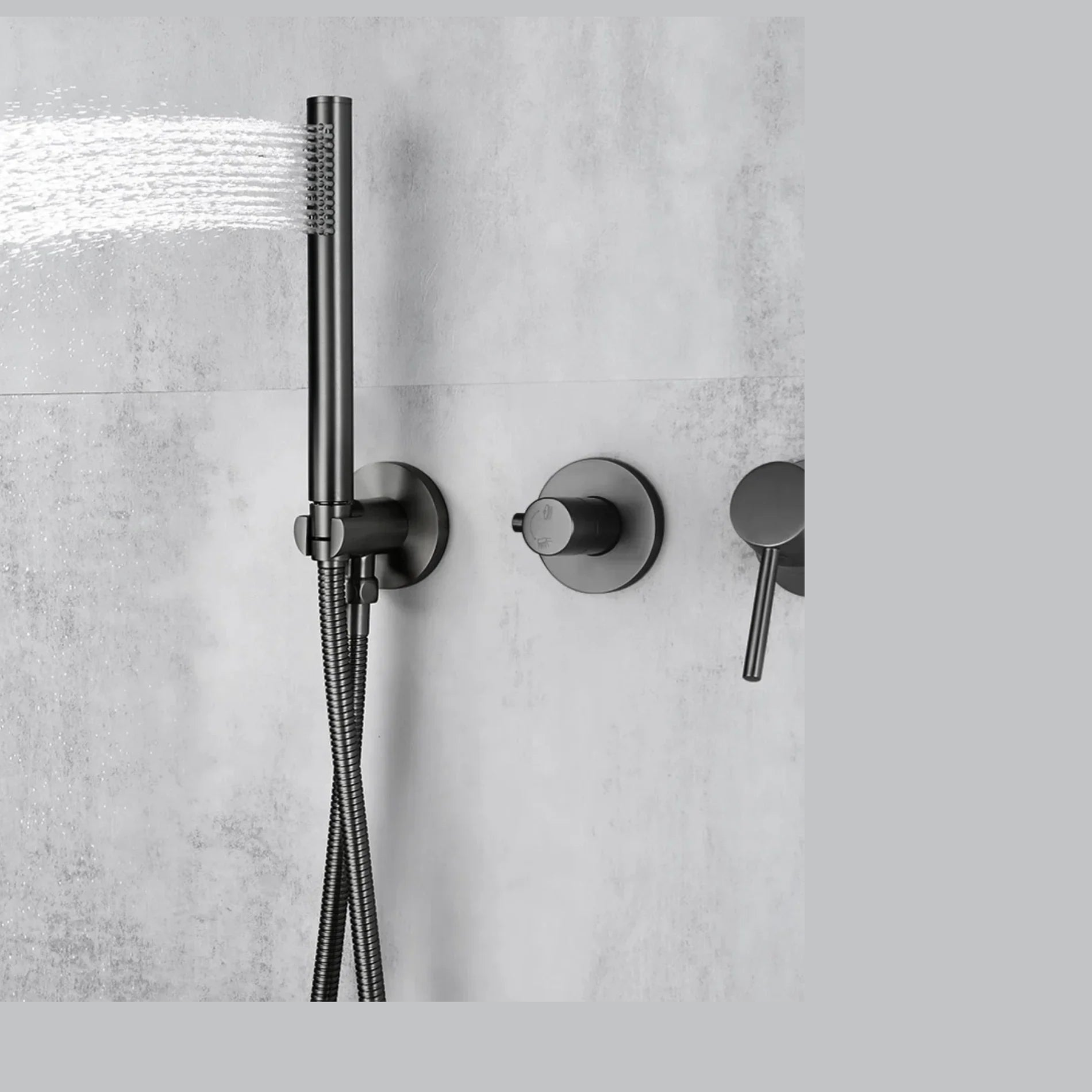 Ensemble de douche en finition gris brossé, équipé d'une douchette à main au design épuré et d'un mitigeur avec inverseur. Le ciel de douche encastré est un véritable chef d'oeuvre. Cet ensemble de douche est constitué de laiton et d'alliage d'acier inoxydable pour une durabilité inégalée.